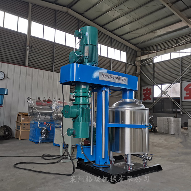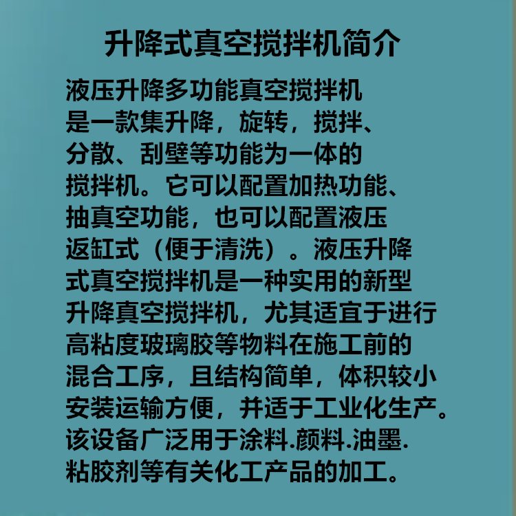 升降式真空攪拌機(jī)可以升降,旋轉(zhuǎn),攪拌分散刮壁,抽真空,也可以配置電加熱。升降式真空攪拌機(jī)由電動機(jī)全速運(yùn)轉(zhuǎn)帶動主軸,經(jīng)主軸轉(zhuǎn)動攪拌框內(nèi)之四氟攪拌片,使其將桶槽內(nèi)之液體經(jīng)框槽上、下兩側(cè)之導(dǎo)流葉片吸入環(huán)狀框槽內(nèi),經(jīng)以主軸為中心高速旋轉(zhuǎn)葉片;連續(xù)使四氟攪拌片與筒體間小之間系高頻率之強(qiáng)力切割剪斷、粉碎,再借葉片高速離心旋轉(zhuǎn),持續(xù)循環(huán)混合,以短之時間即可完成攪拌,分散,刮壁,刮邊之作用。升降式真空攪拌機(jī)配置兩個主電機(jī),一個高速一個慢速。高速電機(jī)作用攪拌分散作用,慢速電機(jī)刮壁,刮邊作用。本攪拌機(jī)刮壁式攪拌裝置,增進(jìn)產(chǎn)品的生產(chǎn)速度,一邊攪拌一邊刮壁,攪拌物料無死角。升降式真空攪拌機(jī) 適用于化工,醫(yī)藥及食品,調(diào)理食品(醬料類)、制藥(膏霜類)、日化(膏霜類)、膠粘劑,涂料等黏度(或)濃度較高的物料的預(yù)煮、配(炒)制,攪拌,濃縮。并可按工藝需要配備真空系統(tǒng)。